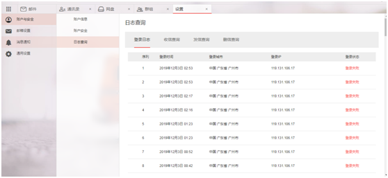 出差情況下,若使用阿里企業(yè)郵箱移動(dòng)端比較多,移動(dòng)端的IP漂移的比較嚴(yán)重,所以IP經(jīng)常在變化的,那么如果是在周邊城市,那么就是這種現(xiàn)象引起的.這個(gè)時(shí)間不用太過(guò)于擔(dān)心.可以登錄郵箱webmail--設(shè)置--歷史記錄查一下登錄記錄有沒(méi)有錯(cuò)誤的現(xiàn)象出現(xiàn),一般密碼只有帳號(hào)所屬人最清楚,若為盜號(hào)行為,均會(huì)有登錄失敗的日志.